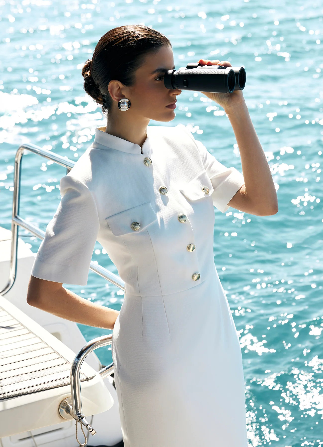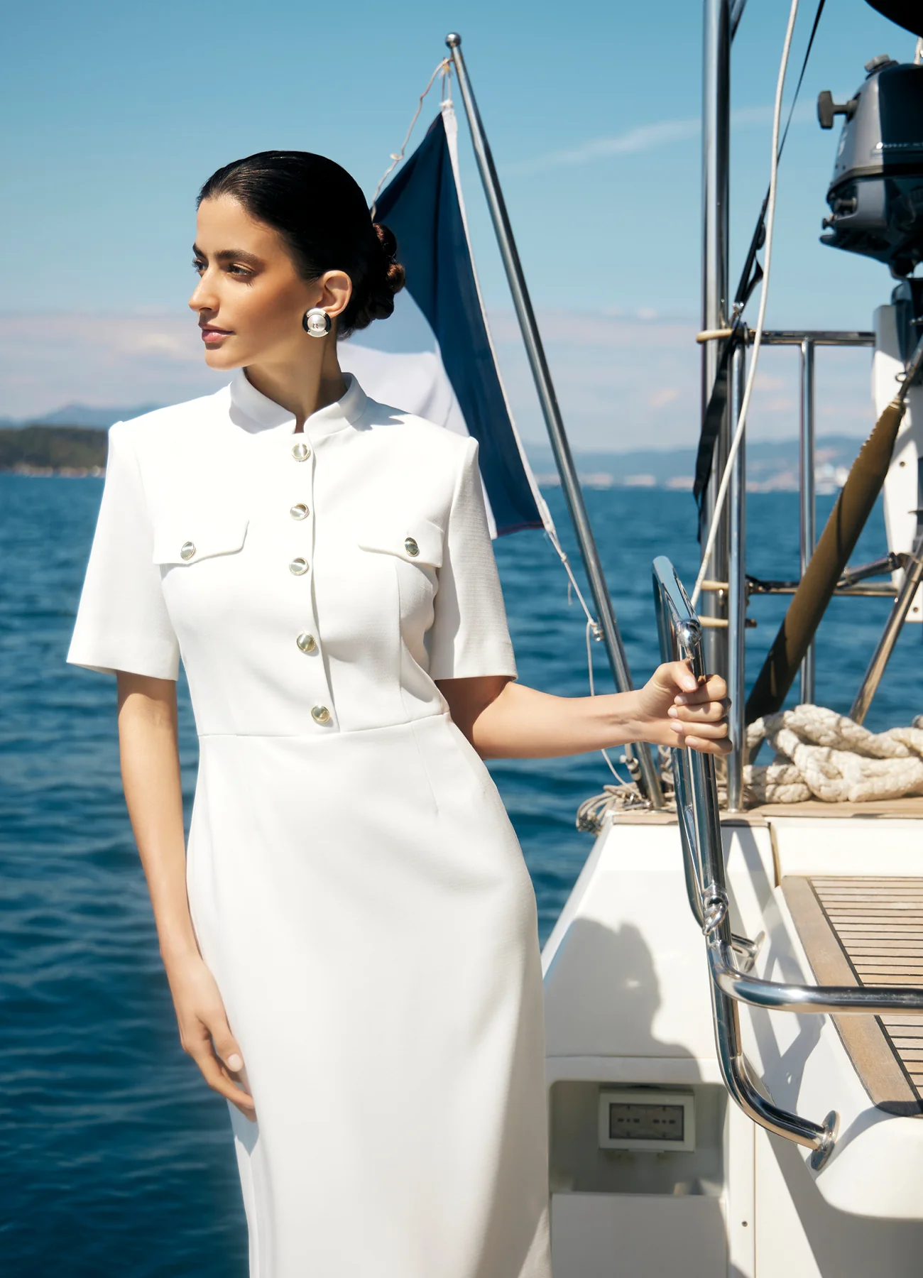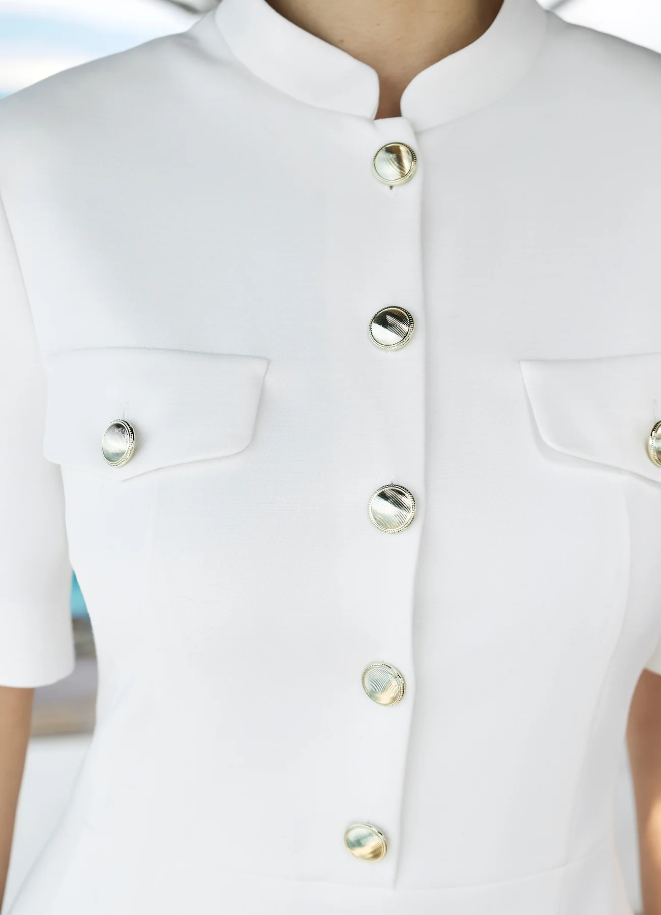 Платье Admiral — современная интерпретация морского стиля с архитектурной чёткостью силуэта. Выполнено из плотной ткани на основе хлопка и вискозы. Воротник-стойка, нагрудные клапаны и крупные золотистые пуговицы отсылают к офицерской эстетике, но в женственном прочтении. Дополните лодочками для завершения образа. На молнии.