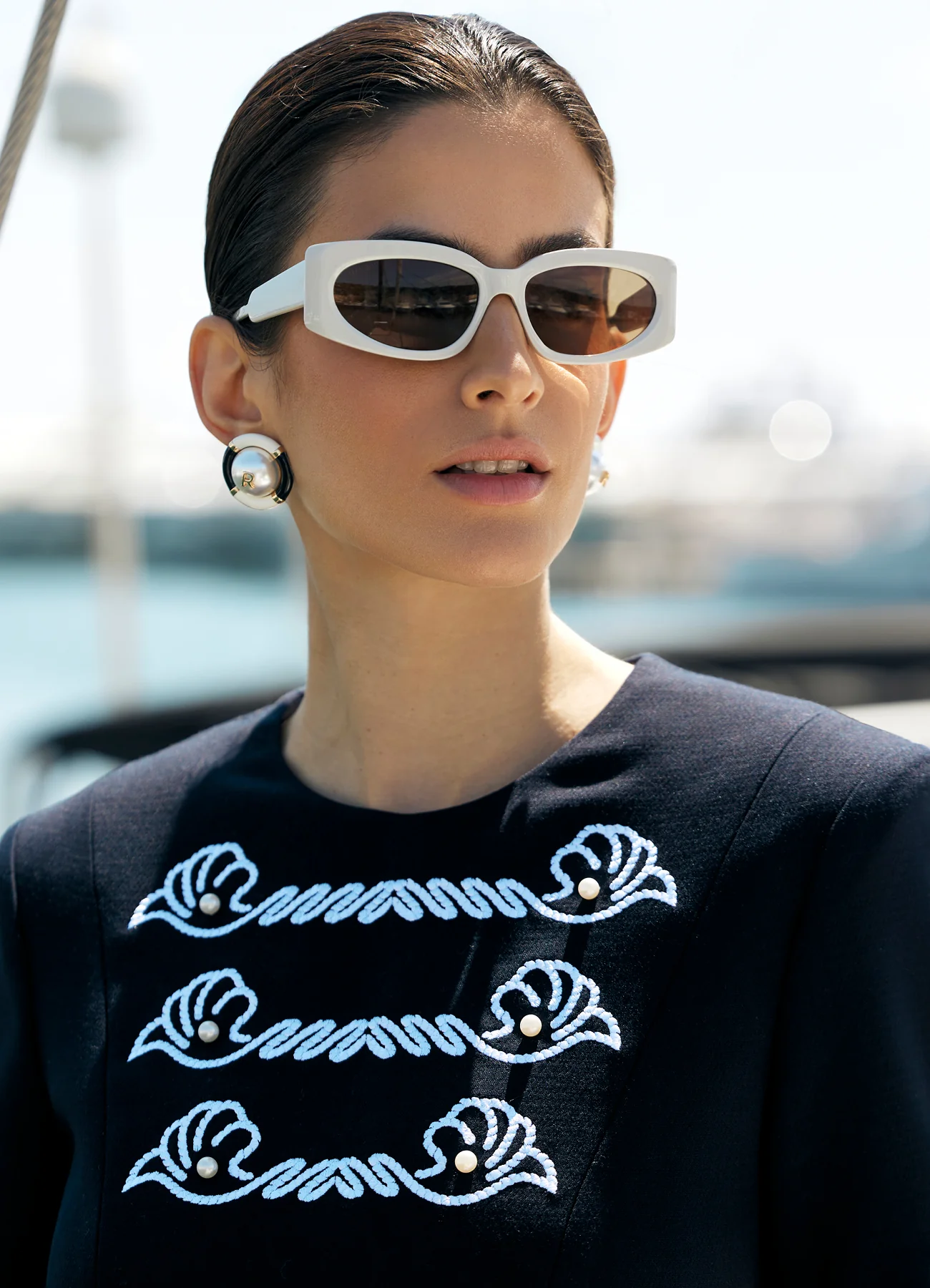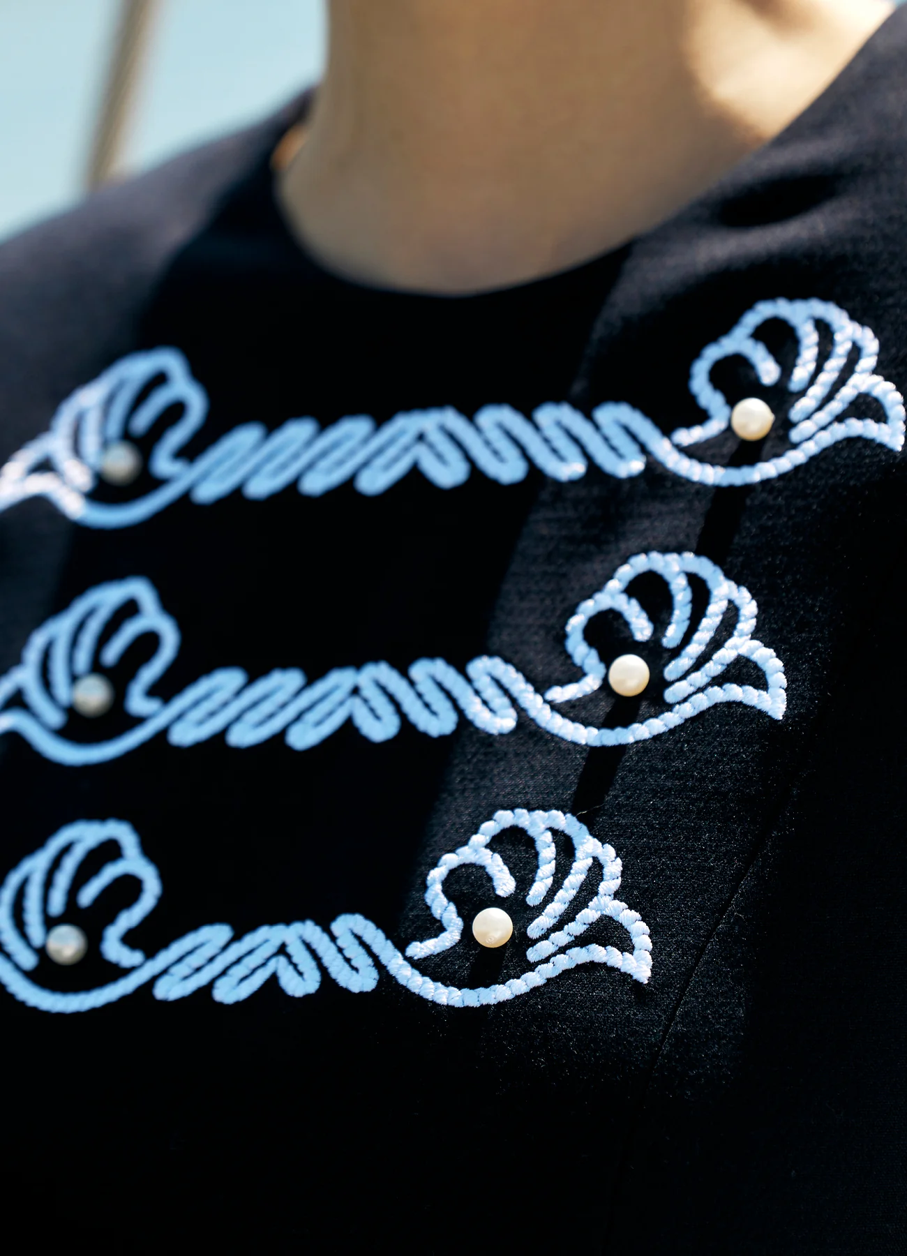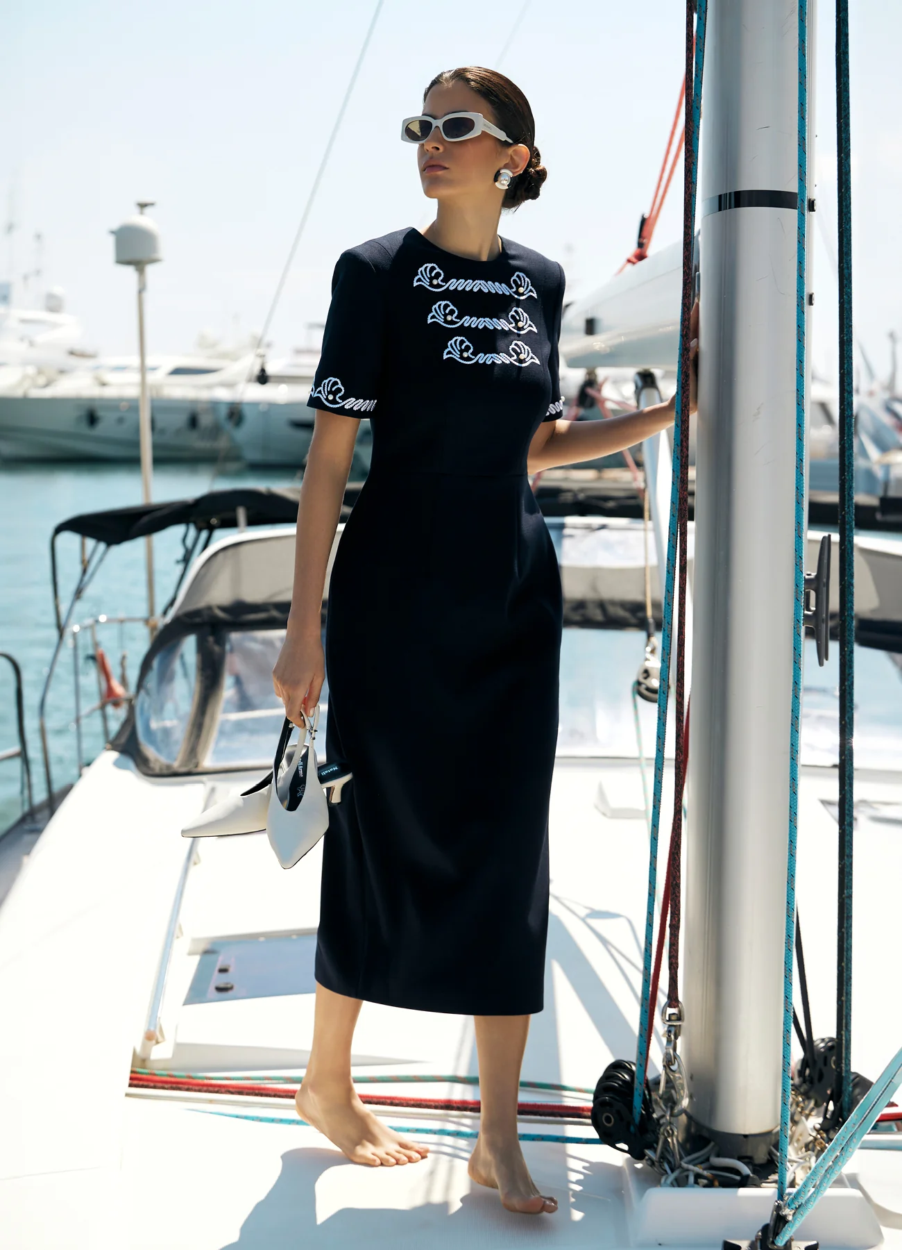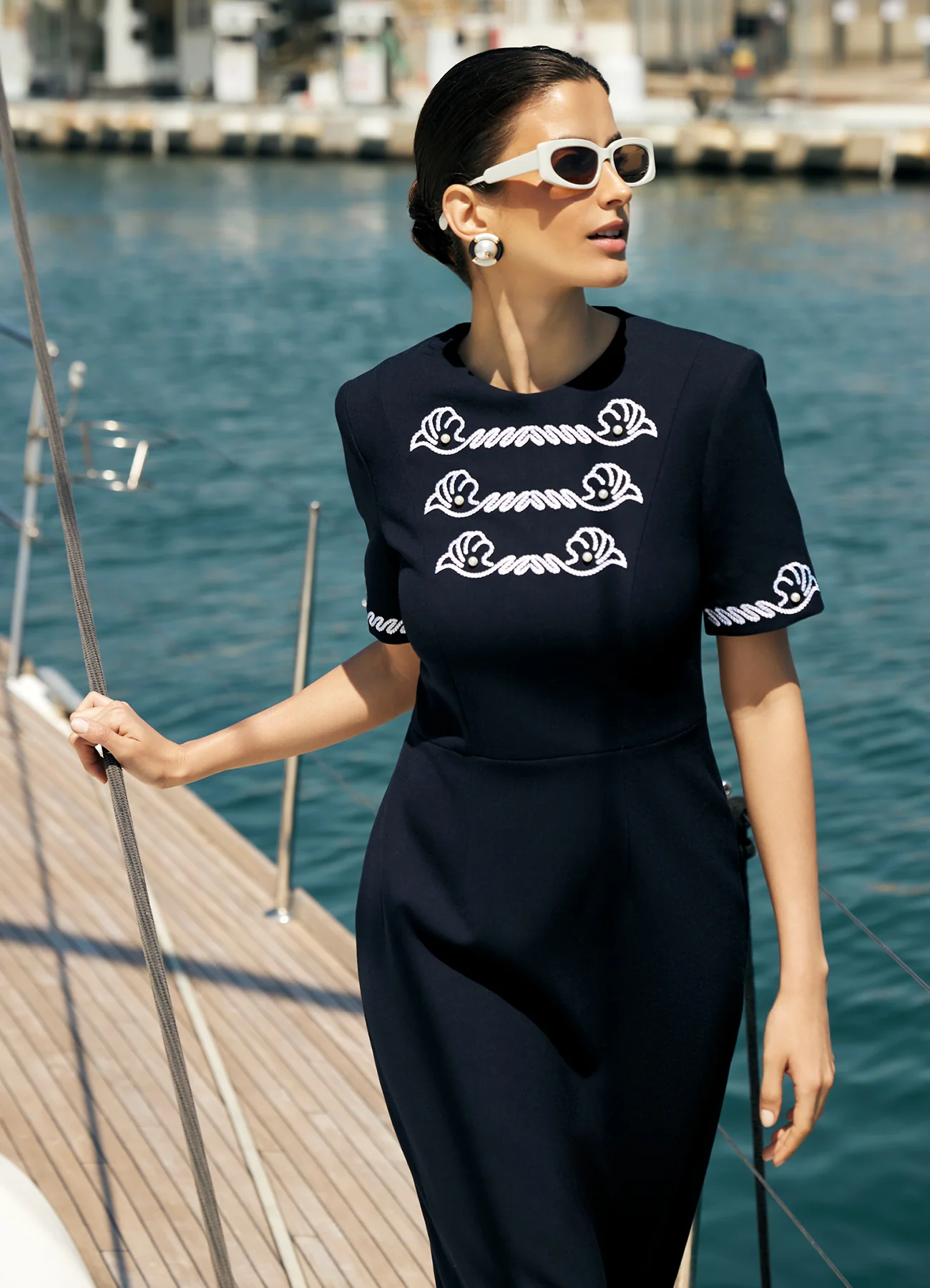 Платье-футляр Nautica из костюмной ткани с коротким рукавом. Центральный акцент - контрастная вышивка в форме морских раковин с жемчужными бусинами. Материал на основе хлопка и вискозы комфортен для теплой погоды, универсальный крой подойдет для непринужденых прогулок и деловых встреч.